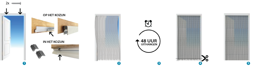 Ein Kunststoff-Fadenvorhang wird fertig montiert in der angegebenen Maßgröße inklusive Aufhängesystem geliefert, mit dem der Vorhang einfach in oder auf dem Türrahmen montiert werden kann. Das Material ist feuchtigkeitsbeständig und daher auch für die Außenmontage geeignet.