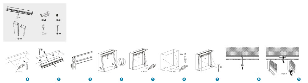 - Zubehör zur Montage des Fliegengitters (sowohl IM als auch AUF dem Rahmen)