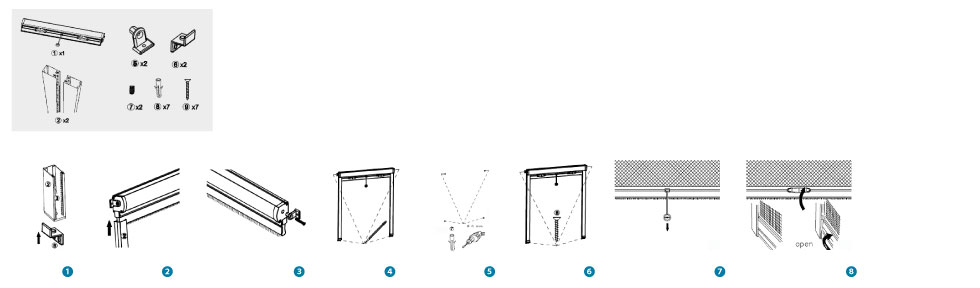 >p> Schritt 1: Klicken Sie auf die Klammern unter den Seitenführungen. >p> Schritt 2:Schieben Sie die Seitenführungen auf beiden Seiten in die Kassette. Schritt 3: Klicken Sie die Halterungen auf beiden Seiten der Kassette an. Schritt 4: Markieren Sie die Bohrlöcher mit einem Bleistift. Schritt 5: Bohren Sie die markierten Löcher mit einem Bohrer (6 mm) in Ihren Rahmen und setzen Sie die Dübel ein. Schritt 7: Hängen Sie Ihr Fliegengitter in den Fensterrahmen ein. Sie können das Fliegengitter mithilfe der Schnur herunterlassen. Schritt 8: Drücken Sie das Fliegengitter unten leicht von sich weg. Es öffnet sich und rollt sich langsam auf. ... Verzögerter Wickelmechanismus über integrierte Bremse