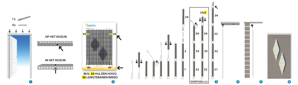 Een doe-het-zelf pakket wordt geleverd als los materiaal, te weten: (standaard) aluminium bevestigingsstrip inclusief schroeven, (halve) haken, (halve) hulzen, ophanghaken en een handleiding. Met behulp van deze duidelijke handleiding rijgt u zelf uw unieke vliegengordijn.